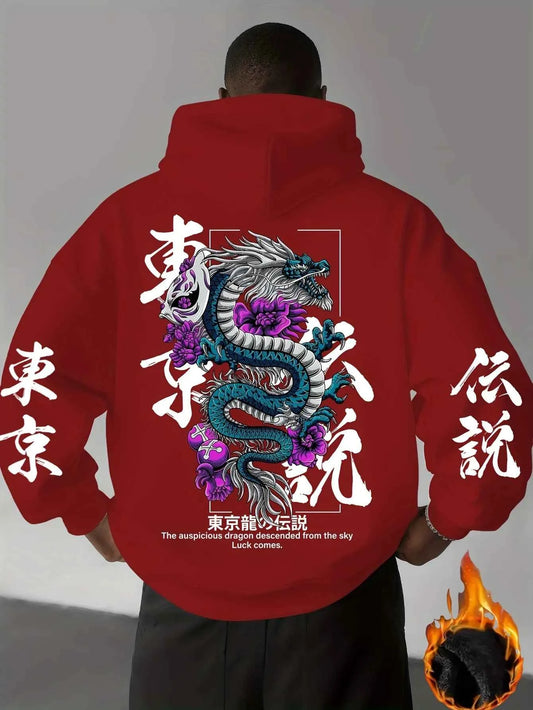 Men's Dragon Hoodie - Chinese Character Print, Loose Fleece Streetwear